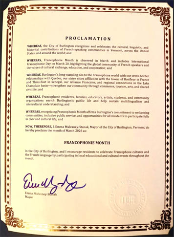 During the ceremony, Burlington mayor Emma Mulvaney-Stanak underscored the essential contribution of Francophone communities to the region’s economic, social, and cultural vitality, reaffirming her commitment to promoting linguistic diversity.